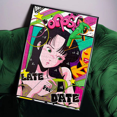 Il puzzle da 500 pezzi "Crush O'Clock" esplode di colori pop, riferimenti al mondo dell’anime e del fumetto giapponese, e uno stile grafico che richiama le copertine vintage dei manga anni ‘80 e ‘90. Sullo sfondo, dettagli esuberanti e dinamici raccontano una storia frizzante e coinvolgente, mentre il protagonista maschile sembra lanciarsi in una corsa contro il tempo.